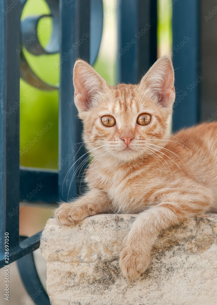Cute Young Red Tabby Cat Kitten Posing On A Wall In Front Of A Blue Iron Garden Fence Looking Curiously With Orange Colored Eyes Cyprus Stock Photo Adobe Stock